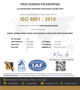 Fresh Horizon – Bringing Nature’s Best to the World With more than 10 years of experience in exporting fresh fruits and vegetables to global markets, Fresh Horizon was officially established in 2024 to meet the growing demand for high-quality produce from Egypt. Since its foundation, the company has focused on delivering premium products that meet international standards while building long-term partnerships across Europe, the Middle East, and soon Africa.